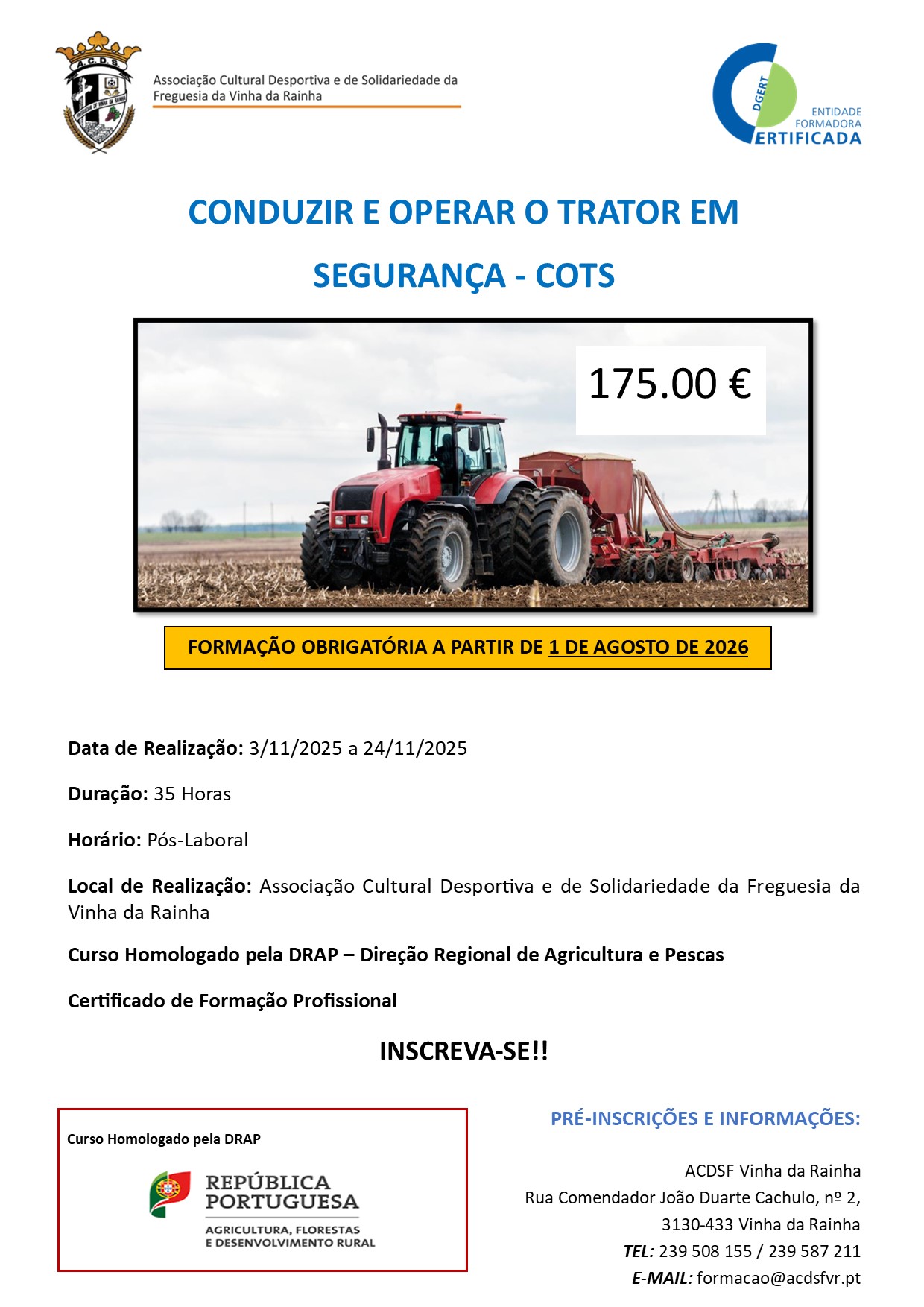 A ASSOCIAÇÃO DA VINHA DA RAINHA VAI INICIAR O CURSO DE 3 a 24 NOVEMBRO DE 2025!