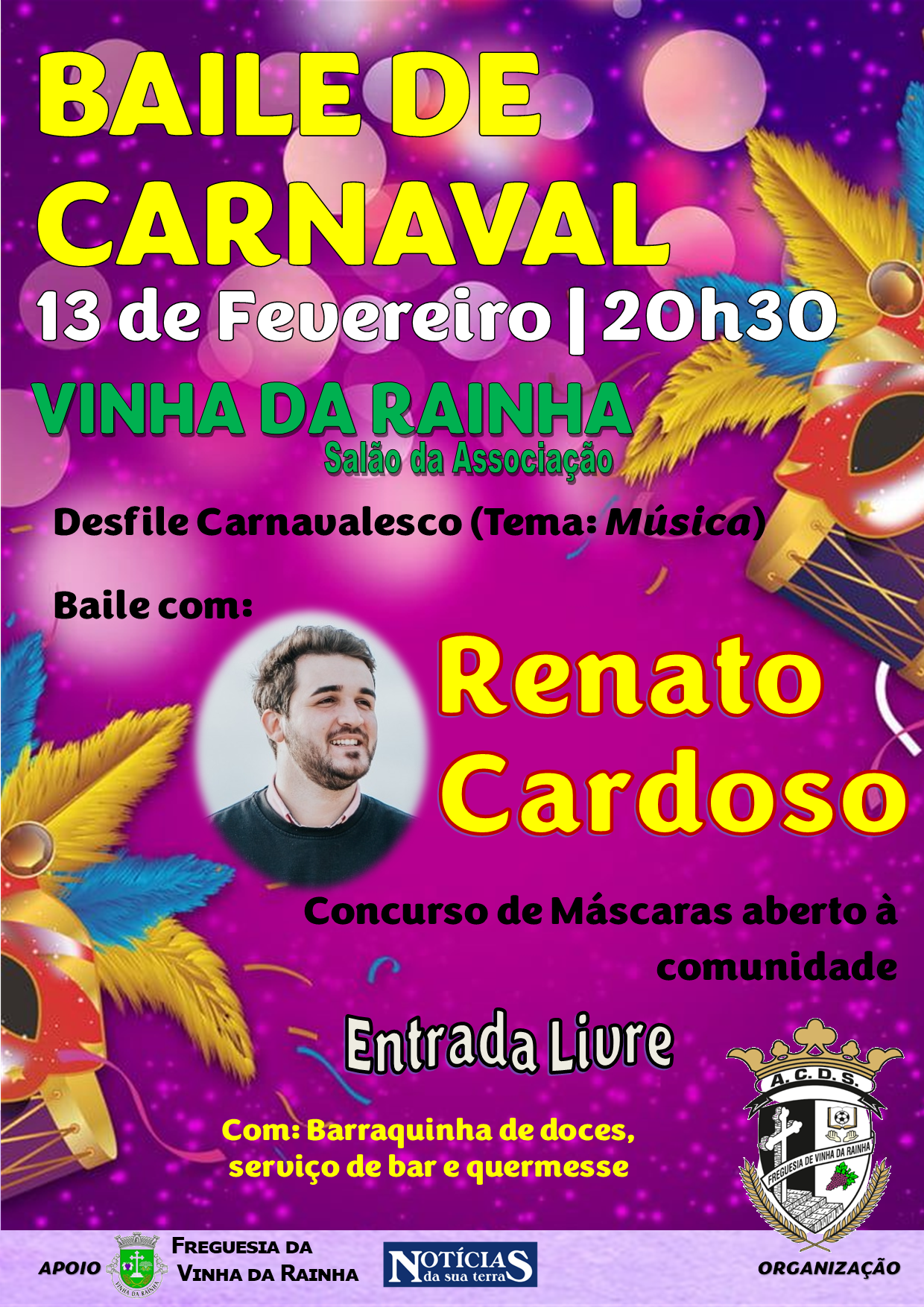 O espírito carnavalesco já começa a sentir-se e promete muita animação com a realização do Baile de Carnaval, que terá lugar no próximo dia 13 de fevereiro às 20h30, no salão polivalente da Associação Cultural Desportiva e de Solidariedade da Freguesia da Vinha da Rainha.